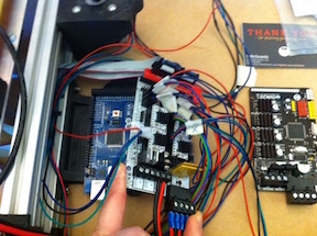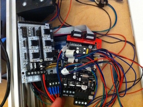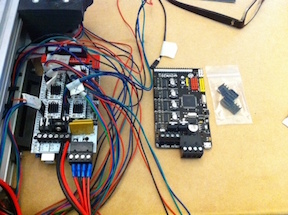 While running the homing test with printrun, I noticed that the z motors were going in the wrong direction. They were going up instead of going down. I had the z motors plugged in the same direction that I had plugged in the x, y, and extruder motors on the original electronic setup. I unplugged the z connectors and reversed them. That fixed the direction issue. Next I did the movement test where I move x, y, and z to 100. Then I measure how much they moved. When I previously did the movement tests on the old electronics, the x and y were correct, but the z was not. This time all the axis movements were off. Each was only moving half of what they should. I made adjustments in the Marlin setup and uploaded the changes to the OVM20. That issue was fixed. I did a preliminary test on the heat bed. I let the heat bed get to 75C and then I shut it off. I didn’t time how long it took. I quit for the night since it was getting late. I still have to adjust the stepper motors since they are humming a bit with the default settings of the OVM20. I will also do timed heat tests on the hot end and the heat bed. Until next time.