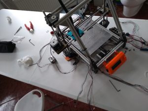 Lastly I hooked up all the wiring for the stepper motors, the end stops, the heatbed, the hot end, the thermistors, and then the fans.