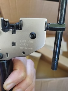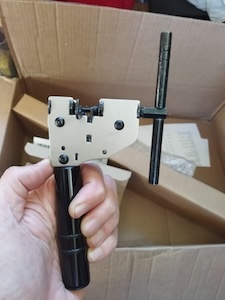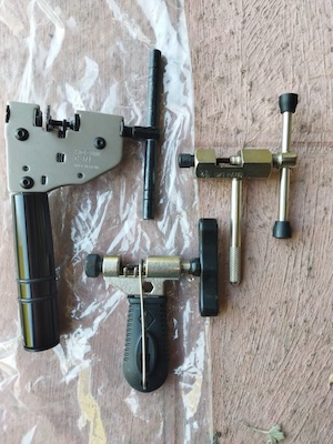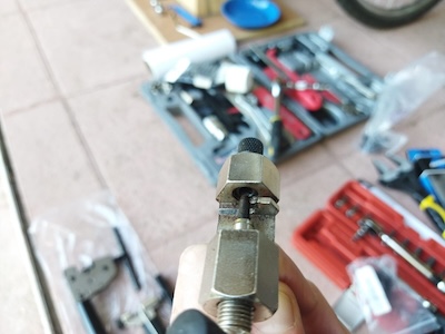 Now I am sizing and installing the chain. I get to use my new Hozan chain tool. There are three popular ways to size your new chain. The first method was used by the late Sheldon Brown who was a well known bicycle mechanic and proponent of bicycling. His website had tons of information on bicycles which I have used on a number of occasions. His website is still maintained by his friends and family To use the Sheldon Brown chain sizing method, you put the chain around the larges sprocket on your rear gears and then put the chain around the largest chainwheel on the front. Usually the front derailleur is shifted to the largest chainwheel, but I don’t see that it matters. Don’t feed the chain through the rear derailleur, just make sure the derailleur is out of your way by shifting it to the smallest sprocket. But make sure the chain fits on every tooth of the rear large sprocket that it can be on. As the chain is around the rear large sprocket and the front largest chainwheel, pull the chain tight and find the closest matching link that you can connect to. Then go back down the chain one link (maybe 2 if you are using a master link) and at that point is where you will break the chain to size it.
